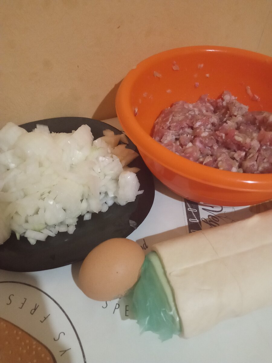 Лук режем мелкими кубиками. В фарш добавляем лук, солим, перчим по вкусу, зиру немного растереть пальцами добавить 1-2 шепотки, в фарш добавить пол стакана холодной воды для сочности. Все хорошо перемешиваем. Тесто разрезаем на кусочки, раскатываем по 5мм квадратной формы. Кладем фарш по 2ст ложки.
