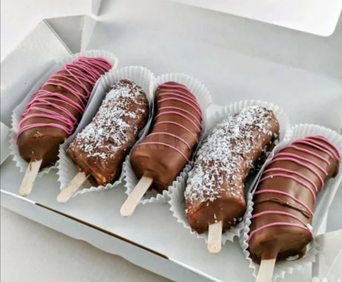 1) Очистить и нарезать наши бананы поперёк. Нанизать каждую половинку банана на 2 деревянные шпажки.