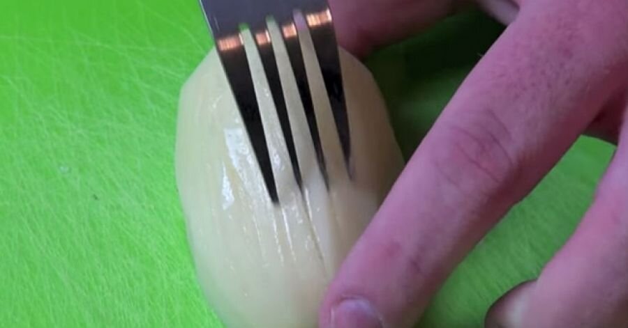 Затем наступает главное действия этого “обряда”. Возьмите вилку и немножко поцарапайте картофель. Важно царапать не сильно и не оставлять слишком глубоких борозд.