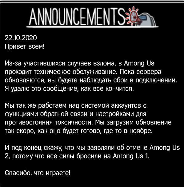 Два дня назад, в игре Among Us появлялось сообщение от разработчиков. Думаю, не только лишь все смогли перевести и понять, что в нем написано. Поэтому это решил сделать я и донести до вас.