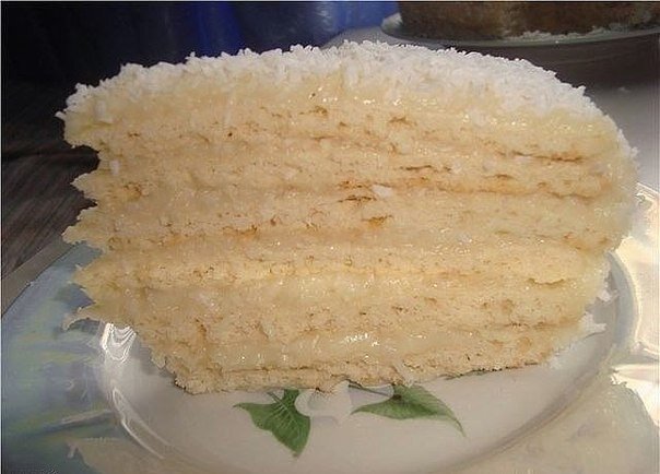 КРЕМ:2 яйца, 1 стакан сахара смешать, добавить 1,5 ст.л. муки, 400-500 мл. молока, все взбить, поставить на огонь. Помешивая, довести до кипения, сразу снять с огня, добавить 200 гр. сливочного масла, перемешать. Коржики выпекать несколько минут. Пока коржи еще теплые, смазать их кремом. Посыпать кокосовой стружкой.