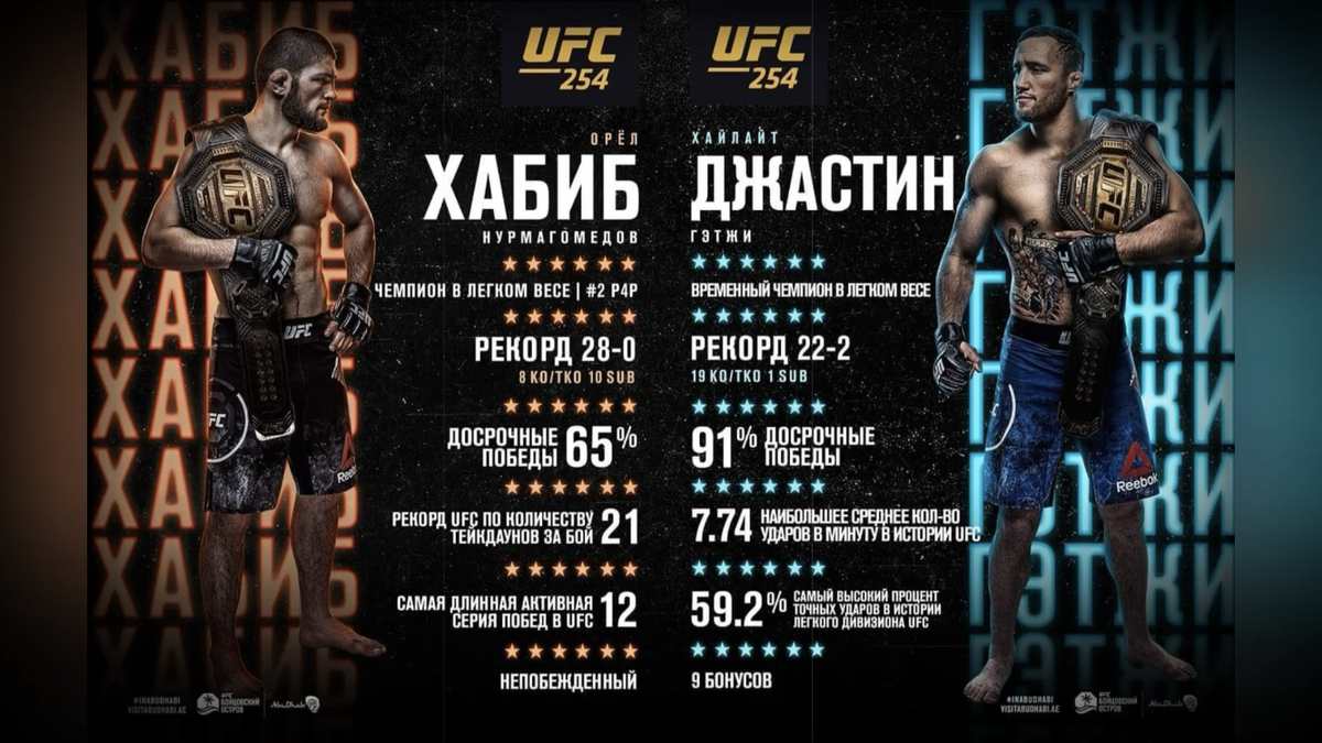 24 октября 2020 года на «Бойцовском острове» состоится бой действующего чемпиона в лёгком весе Хабиба Нурмагомедова и обладателя пояса временного чемпиона Джастина Гейджи. В карде ивента UFC 254 значатся бои сразу пяти российских бойцов, но именно Хабиб привлекает максимальный интерес болельщиков по всему миру. Дата и время выбраны не случайно: в UFCориентировались на Россию и старались