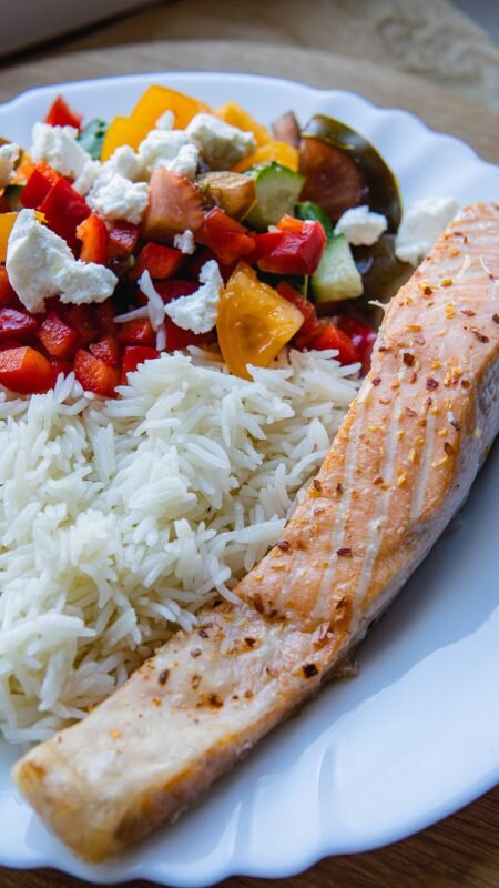Пока греется духовка, режем порционно лосось, солим, перчим и выкладываем на противень. Выпекаем 20 минут.