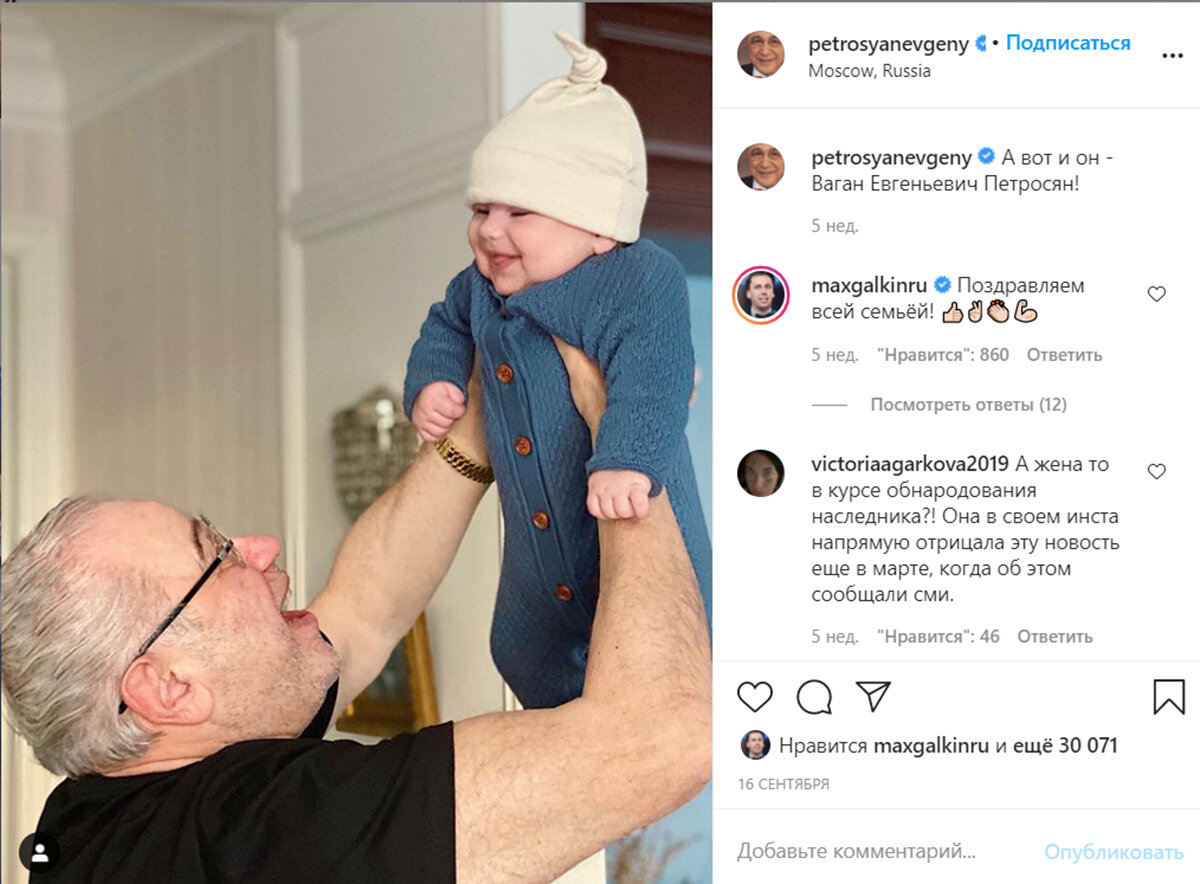 У известного эстрадного артиста – Евгения Петросяна родился сын – Ваган Евгеньевич. Как признался в интсаграм Евгений Ваганович – сына родила его жена Татьяна Брухунова. Сын родился в марте 2020 года, но официально супруги подтвердили рождение только сейчас. Ранее ходили слухи о том, что ребенка вынашивала суррогатная мать, но артист отверг эти предположения. Теперь Евгений Петросян часто берет