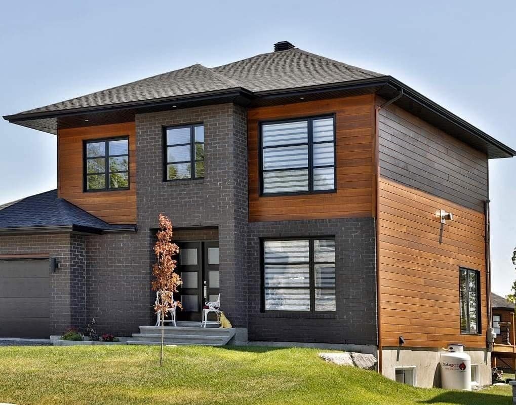 Фасад мы планировали из двух материалов: базового и декоративного. В качестве декоративного предстоит выбрать между планкеном и панелями по типу Кедрал с текстурой дерева. А вот с базовый пока выбираем. Рассматриваем разные