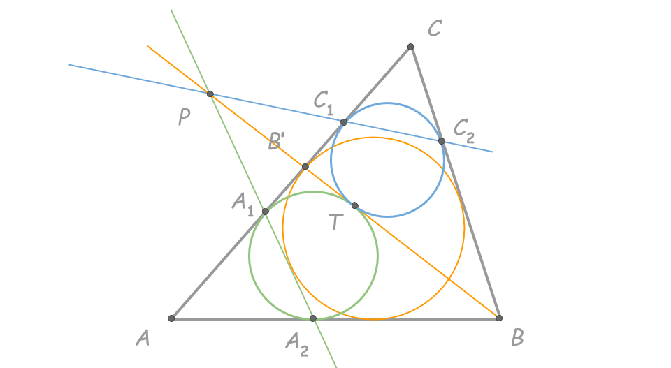 Точки A₁, A₂ и С₁, С₂ — точки касания зеленой и синей окружностей со сторонами △ABC, см. рисунок.