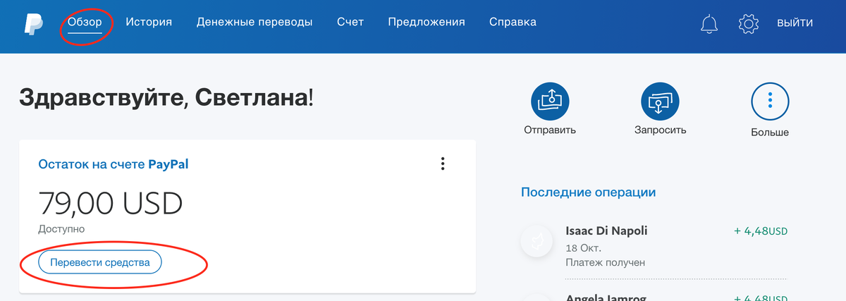 Находясь на странице "Обзор" нажимаете "Перевести средства":