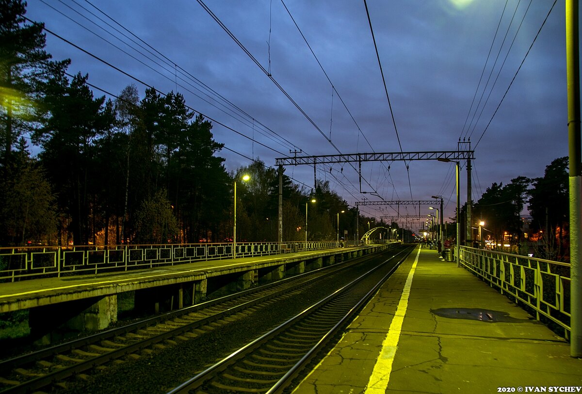 1. Итак, собственно ночной (а точнее все же еще вечерний, Солнце хоть и ушло, но еще не окончательно стемнело) вид того самого остановочного пункта Заря, который фигурирует в самом первом предложении. При этом платформы освещены и освещены достаточно, рельсы блестят, пассажиры ждут электричку.