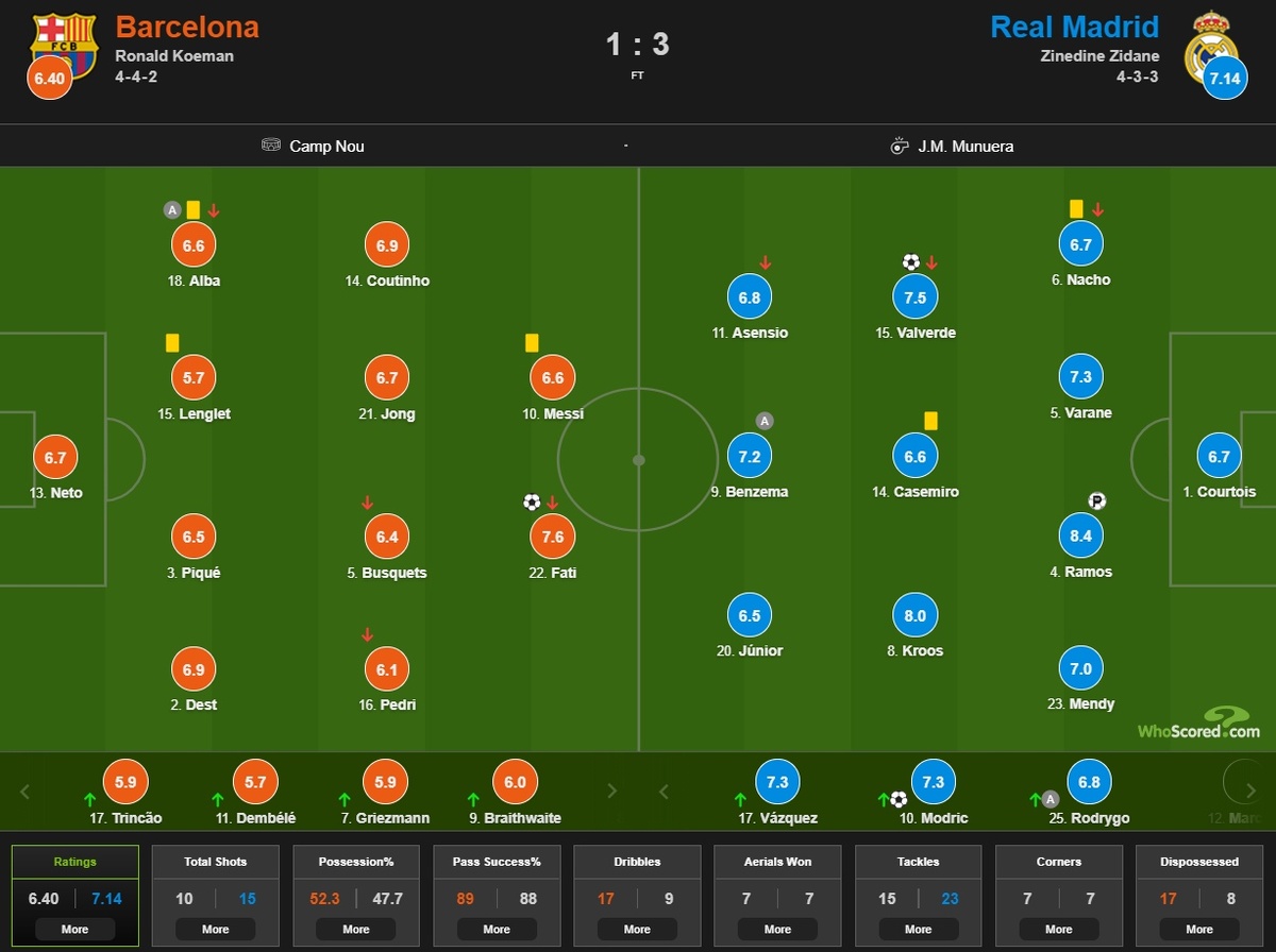 Просто ужасающий процента брака показал Бускетс, даже без учета голевой ошибки. Полузащита «Реал» выглядела гораздо более организованной и надежной. Каземиро – Кросс – Вальверде против Де Йонга и одной ноги Бускетса. При этом, даже видя эту Берлинскую стену из полузащитников, «Барселона» продолжала упорно лезть в атаку через центр. Зидану даже ничего не пришлось придумывать, Куман сам зачем-то бился головой о стенку. И это мучение продолжалось аж до 80 минуты, на которой голландец наконец сделал замены. В то же время, Зидан, проанализировав ход матча, при своих атаках не делал большой акцент на флангах, т.к. это было бессмысленно. Винисиуса под чистую сожрал Дест, ну а Асенсио походу перенял от Бейла не только игровой номер. Вектор нападения сместился на Бензема, который грамотно расчищал пространство для постоянных неожиданных вбеганий Вальверде, а в качестве второго темпа выступали Тони Кросс и Каземиро. Вполне логичный ход – бить своим сильным оружием самую слабую точку соперника.