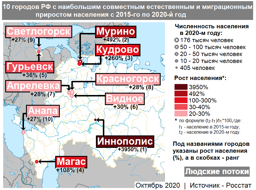 Но это всё на основе оценок валового прибытия. И поэтому я решил поинтересоваться, какие города России демонстрируют наибольший рост именно в процентном измерении. Для этого я проанализировал данные Росстата за 2015-й и 2020-й годы, и на карте внизу поместил 10 таких рекордсменов в данной области за минувшие шесть лет: