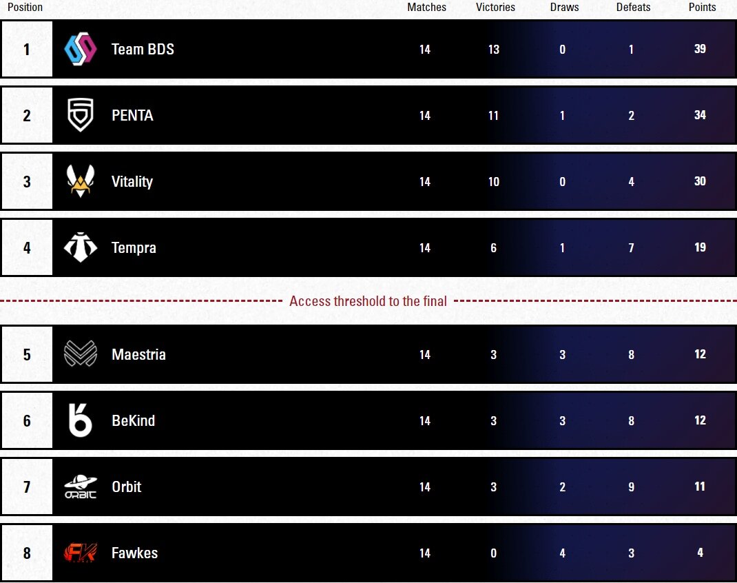 По итогам продлившихся с середины июня матчей в стадию финалов прошли команды BDS Esport, PENTA, Team Vitality и Tempra Esports. Ранее по итогам первой половины сезона коллектив BeKind прошёл в европейскую лигу претендентов, сейчас он занял шестое место, а команда Fawkes распалась в середине сезона и не стала продолжать выступление в лиге.