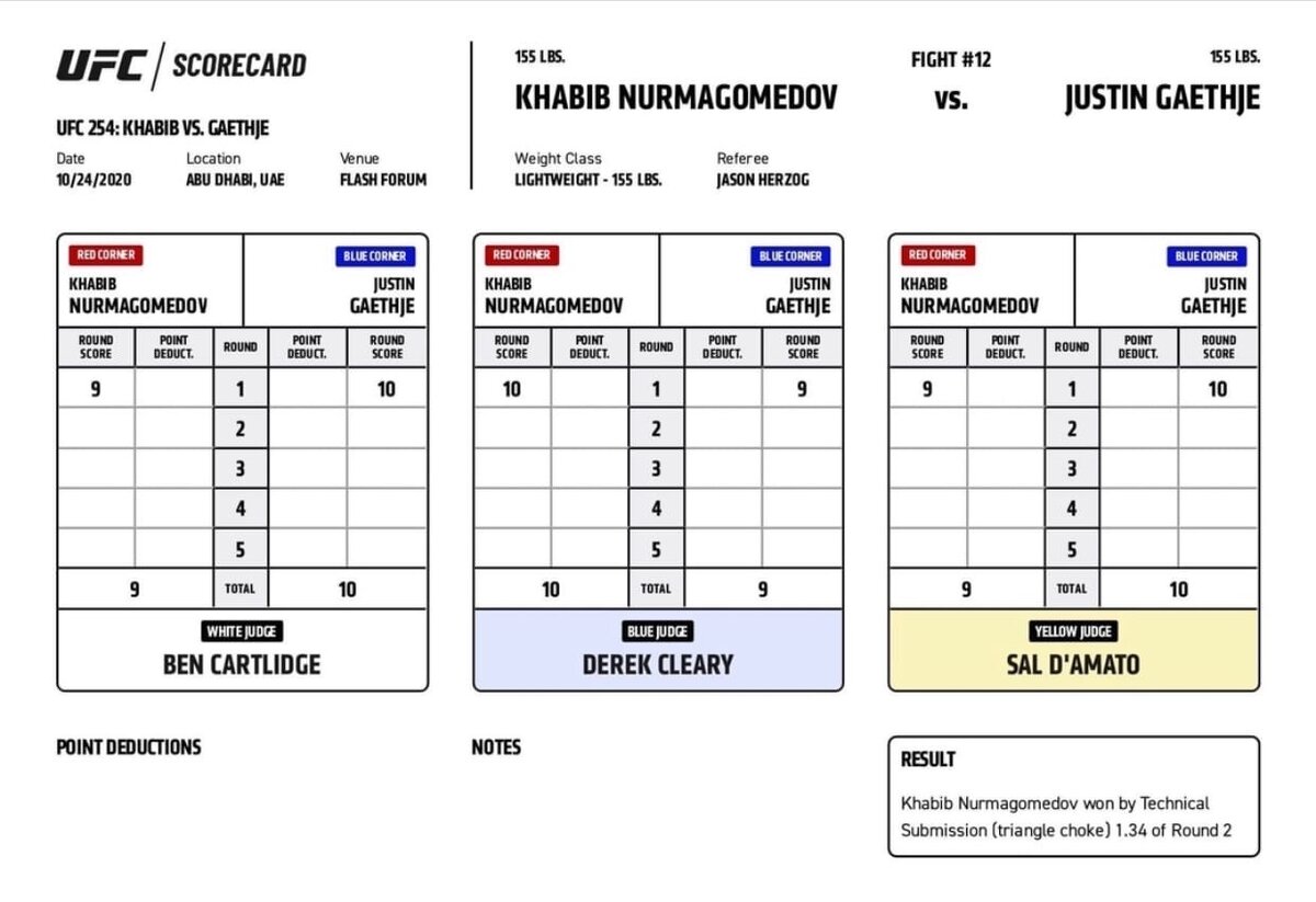 Появились судейские карточки боя. Как оказалось, двое судей из трех отдали победу Гэтжи в первом раунде поединка.