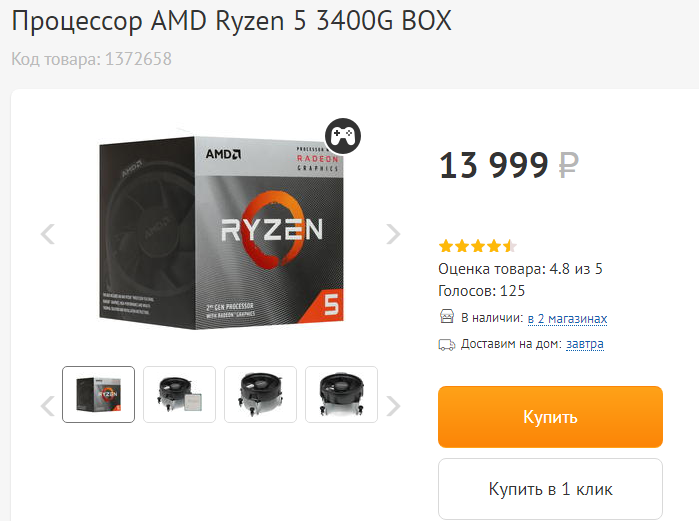 - Начнём с процессора. В нашей сборки будет стоять AMD Ryzen 5 3400G со встроенным видеоядром. На борту данного процессора 4 ядра и 8 потоков по 3700 МГц, а в турбо-бусте 4200 МГц.