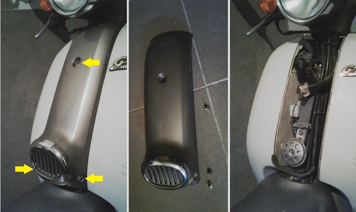 Затем снял боковые обтекатели моторного отсека. Крестообразной отвёрткой выкрутил винт, соединяющий меж собой левую и правую половины боковых обтекателей, он находится сверху недалеко от места крепления сидения (указано стрелками на фото). И два шурупа внизу, с левой и с правой стороны (около сеточек, почти под ними) в местах соединения боковых обтекателей с пластиком пола (расположение указано стрелками на фото, на двух последних фото отвёртка касается головок этих шурупов).