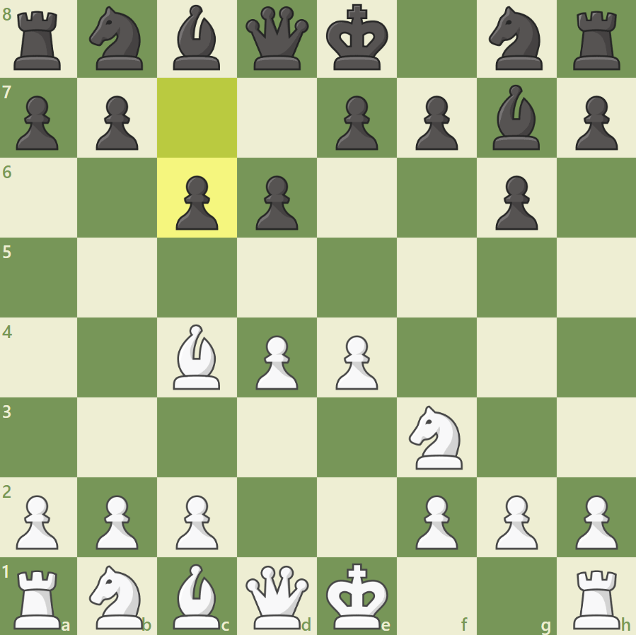 Как мы видим черные пытаются давить на центр свои слоном, а белые тем временем благополучно захватывают центр доски. Этот дебют имеет очень много ответвлении в теории шахмат. Основная мысль черных давить на центр, а белые тем временем должны играть очень быстро, в случае промедления белые теряют инициативу.