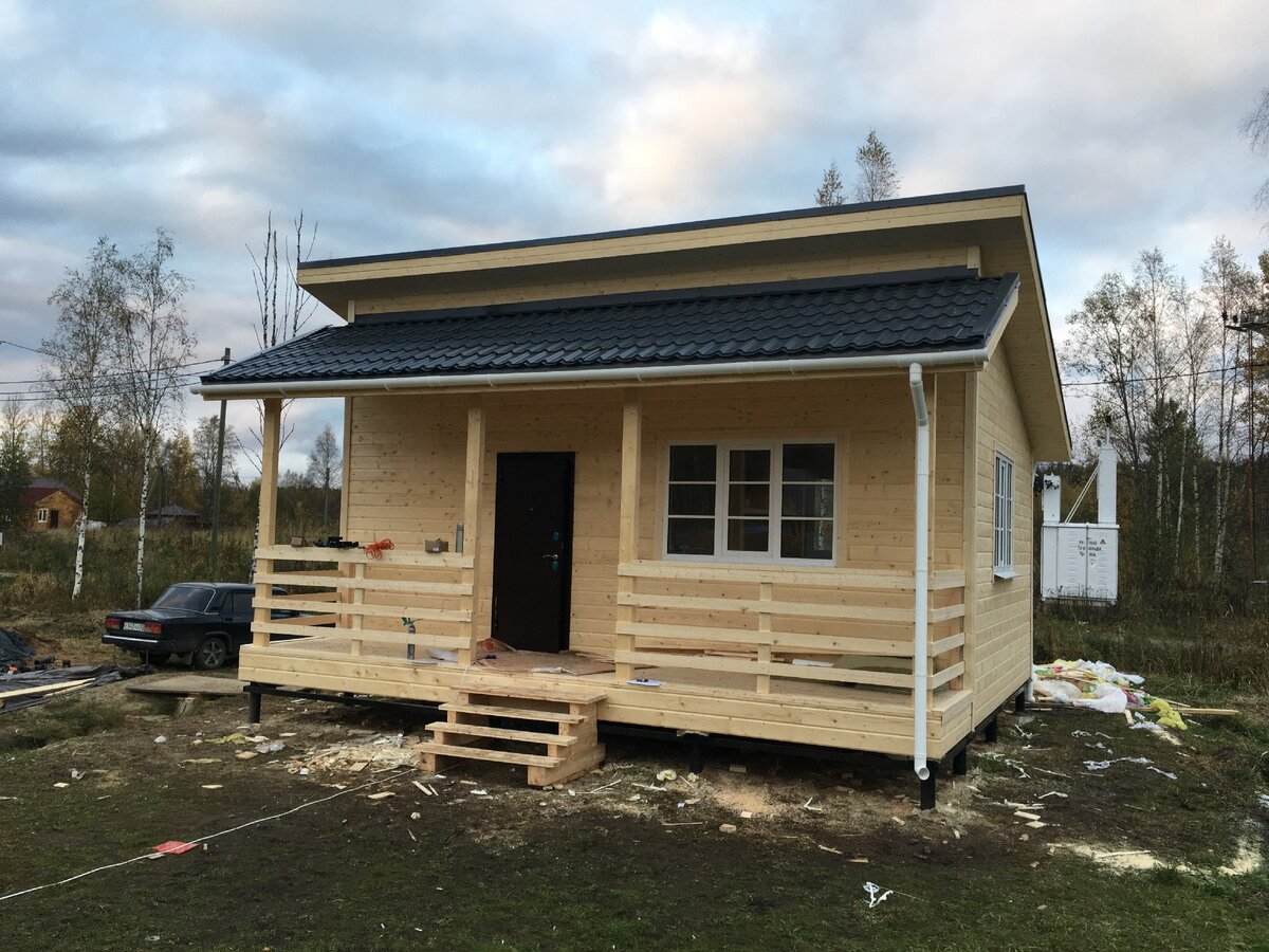 Дом построен по проекту К-8: одноэтажный дом размером 6х7 метров с крытой террасой. Одна из фишек проекта: двухскатная двухуровневая крыша