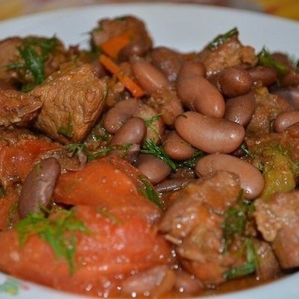 Замочить фасоль на ночь,затем отварить почти до готовности.Порезать мясо кусочками,обжарить до полуготовности,добавить соль,специи,порезанную морковку,лук,сладк перец,залить кипятком,тушить.За 10 мин до готовности добавить фасоль,помидоры.В середине тушения я еще добавила томат пасту.