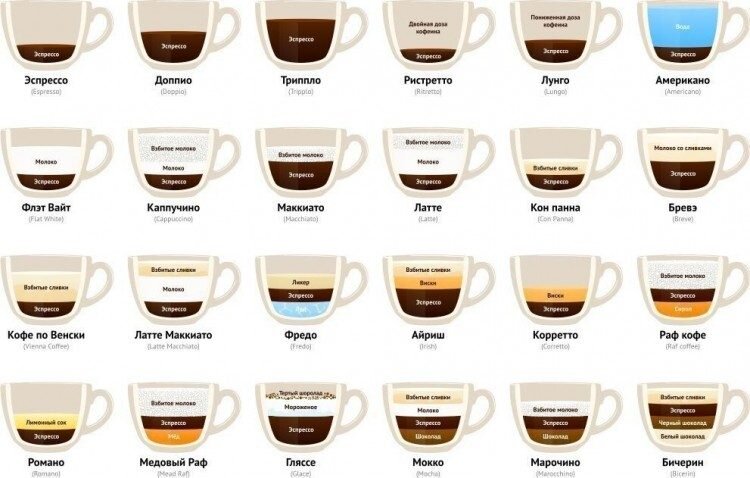 Макиато – в отличие от латте, эспрессо вливают в молоко таким образом, чтобы образовались слои. Сверху помещают молочную пену (на 30 мл эспрессо – 20 мл молока).