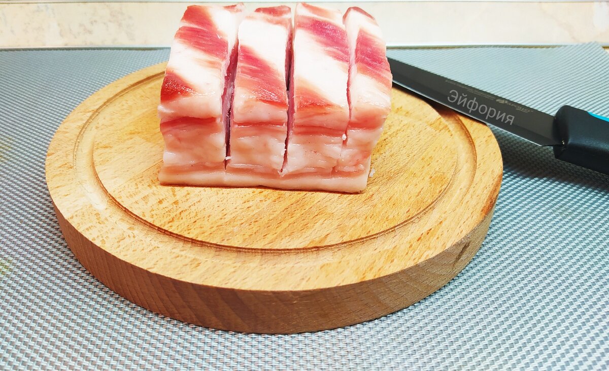 Сало (можно выбрать с мясной прослойкой) мою в холодной воде и срезаю толстую шкуру.