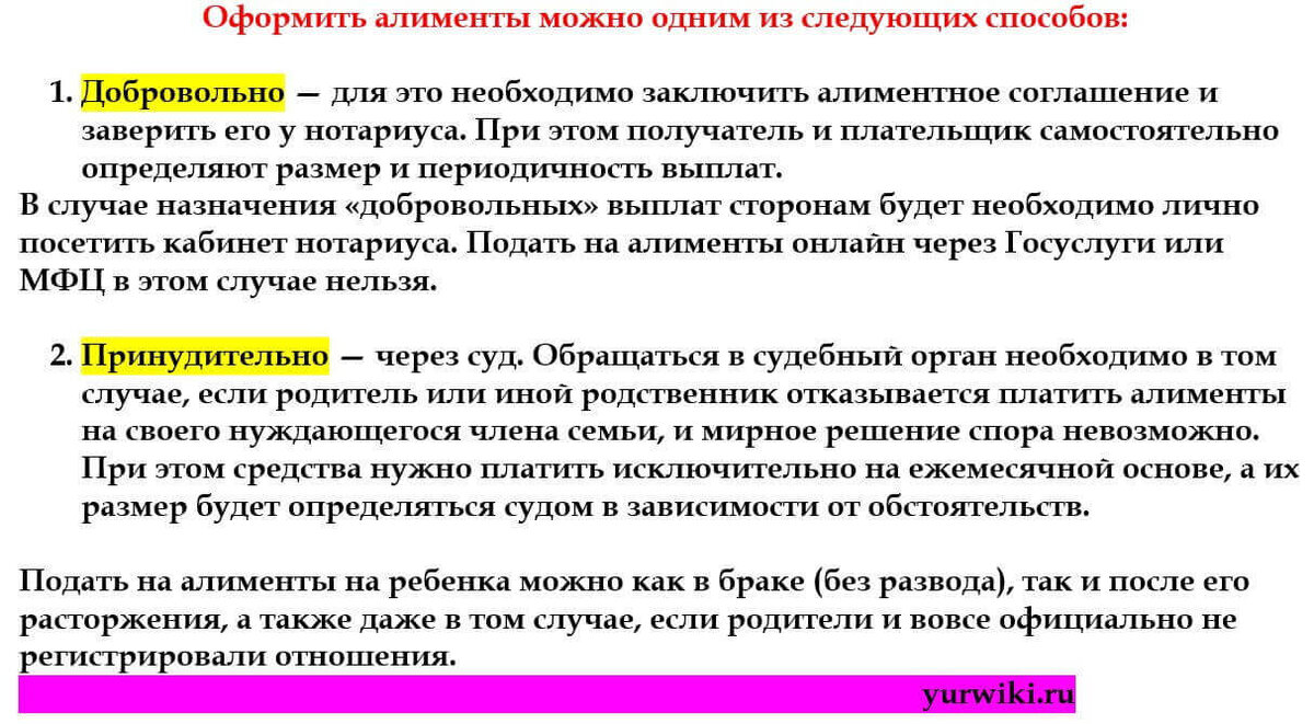 В Семейном Кодексе РФ, ст. 100 обозначено, что заключённое между сторонами соглашение приобретает юридическую силу с момента заверения у нотариуса. Поводом для подписания соглашения является устная договорённость, заключённая отцом и матерью ребёнка после развода или третьими лицами, имеющими право претендовать на алименты, выплачивать их.