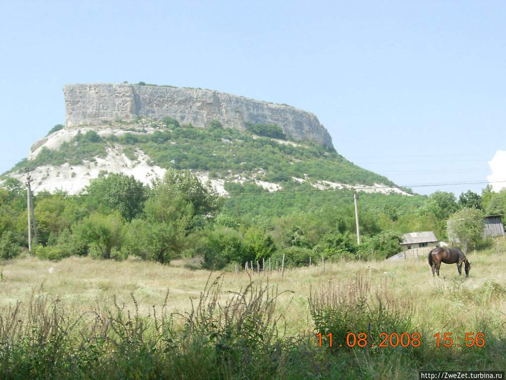 В Крыму великое множество всяких разных исторических памятников. Неплохой климат и очень удобное стратегическое положение привлекали сюда людей, начиная с неолита и заканчивая нашей постсоветской эпохой, когда политики России и многие русскоязычные жители Крыма проклинают Н.С.Хрущева за то. что подарил полуостров Украине в 1954 г. Исторические памятники Крыма охватывают разные эпохи. Дворцы российской знати и татарских ханов, античные городища и еще более древние таврские могильники и многое другое можно найти на этом маленьком клочке земли. Огромная по времени эпоха Средневековье представлена в Крыму специфическими памятниками. Это так называемые пещерные города. Их расцвет пришелся на VII-XII века нашей христианской эры. Да и связаны они, в основном, с победным шествием христианства с юга, — из Палестины на север. Пещерные города Крыма являлись пещерными лишь частично. В пещерах, вырубленных в скалах, находились хозяйственные помещения, зерно-и винохранилища и иногда христианские храмы. Жилые дома, замки правителей и опять таки храмы располагались на плоских вершинах Внутренней гряды Крымских гор. Самый бурный рост подобных поселений (городов и христианских монастырей) пришелся на VIII век христианской эры — в период иконоборчества в Византии. Тогда иконопоклонники бежали от преследований за море на север и основывали в горах Крыма свои поселения и монастыри. Нашествие татаро-монгол погубило большинство пещерных городов и монастырей Крыма, хотя в некоторых из них жизнь теплилась до XVII-XVIII веков. Самый посещаемый туристами в Крыму пещерный город — это, конечно, Чуфут-Кале.Я же хочу предложить всем любителям Средневековья прогулку в другой пещерный город, гораздо менее известный. Для того, чтобы в нем побывать, можно добираться так же, как в Чуфут-Кале: доехать на автобусе или на электричке до Бахчисарая, затем на местной маршрутке № 2, следующей в Староселье, доехать до окраины города и по ущелью Марьям-Дере двинуться к Чуфут-Кале. Мы дойдем до крутого подъема к Южным воротам Чуфут-Кале, но подниматься в гору не будем, а пойдем дальше по неширокой дороге мимо зарослей бузины, кизила и грецкого ореха. Приведет нас эта дорога на древнее караимское кладбище. Караимы — это одна из народностей Крыма; ее представители в изобилии проживали в Чуфут-Кале и даже имели там свой храм — кенассу. Так что нахождение здесь огромного кладбища караимов вполне логично. Надгробия на кладбище датируются XVI-XX веками. Пройдем через старое кладбище и начнем подъем на гору. Дорога выведет нас на очередное плато. Оно ограничено обрывистыми скалами, с которых открываются живописные виды на окрестности. Дорога идет по вершине плато, и здесь важно не пропустить поворот налево и вниз. Если быть внимательным, на камнях дороги можно обнаружить истертую надпись мелом: "Тепе-Кермен". Свернем налево и начнем спуск по довольно крутой каменистой тропинке, вьющейся среди горного леса. Минуя заросли и живописные полянки, тропинка выведет нас к горе, одиноко стоящей среди долины. Это и есть Тепе-Кермен (в переводе с татарского "крепость на горе"). Лесная тропа переходит в крутой подъем на гору высотой 544 м над уровнем моря. Не стоит подниматься на гору в дождь, — по скользкой размокшей глине можно скатиться вниз, как на горнолыжном спуске. Подъем довольно тяжел, — кое-