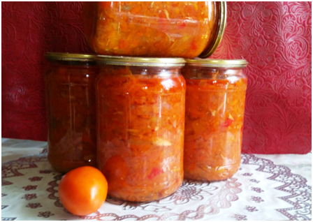 Вариантов приготовления подобных салатов существует много. Обычно я беру 3 килограмма помидоров, по килограмму моркови и лука, полкило болгарского перца и 2-3 свежемороженых скумбрии. А так же стакан растительного масла, стакан сахара (можно меньше. Ориентируйтесь на свой вкус), 2 столовых ложки соли, черный перец горошком и 2 столовых ложки уксуса 70%.