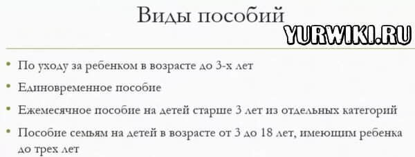 В современное время, имеется возможность получения следующих видов пособий теми гражданами, у которых имеются маленькие дети: