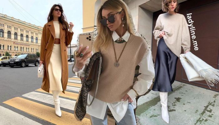 Оверсайз лонгслив пастельного оттенка + шифоновая миди юбка темно-синего цвета + белые остроносые сапоги — look, который предлагают нам собрать современные гуру моды для рабочих будней.