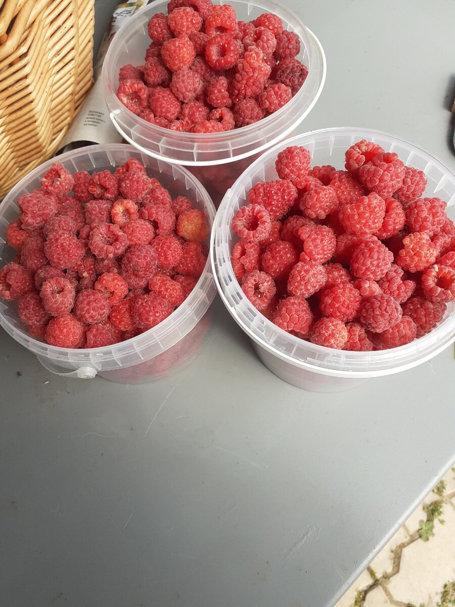 Когда мы с дочкой собрали очередные 5 литров, она предложила: "Мамуль, может, продадим?" Ну, ладно, можно попробовать. Недалеко от нашего дома как раз есть место, где пенсионеры торгуют всякой всячиной. Но почему-то мне всегда казалось неудобным торговать рядом с ними( да, собственно, и нечем было). А дочка без малейших сомнений туда отправилась. Как говорится, нынешняя молодёжь... Без предрассудков, в общем. Сказала:" Я же своё продаю". Но! То ли неудачное время выбрали( уже после обеда), то ли жара в тридцать градусов разогнала покупателей, но за три часа ни одного ведёрка ей продать не удалось. Трагедия была та ещё! Почти до слез:" Ну почему моя малина никому не нужна?!!" Что делать, пришлось переходить на план "Б". Решила дать объявление на Авито. Посмотрела цены: от 150 до 300 рублей за 1 литр. Я поставила цену 200 рублей за ведерко 1100 мл( из-под покупных квашеных овощей, других ёмкостей у меня не было). Честно свой товар сфотографировала: