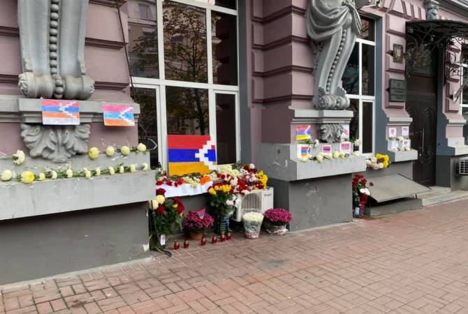 Перед посольством Республики Армения в Киеве украинские армяне чтят память воинов, погибших в крупномасштабной войне, развязанной Азербайджана против Арцаха. Как сообщает Арменпресс, об этом написал на своей странице в Facebook посол Республики Армения в Украине Тигран Сейранян и опубликовал фотографию.