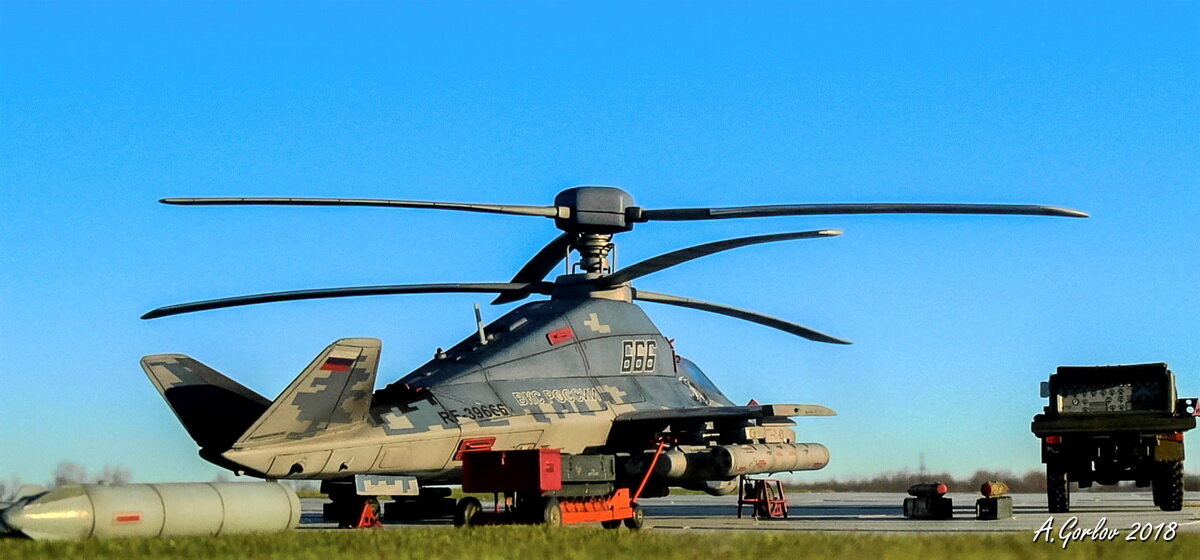 В середине 2000-х на полках магазинов для моделистов поступил интересный набор для сборки- новейший прототип вертолета Ка-58, которому журналисты присвоили громкое имя "Черный призрак". До появления пластиковой модели об этом вертолете никто и не слышал, но в 2018 оказалось, что пластиковая модель может может получить вполне реальный прототип. Внешне, машина выглядит эффектно. Рубленые плоскости свидетельствуют о том, что разработчики предпринимают серьезные меры по снижению радиолокационной заметности машины, а несущий винт выполнен по фирменной камовской соосной системе. Из всех когда-либо существовавших машин, Ка-58 наиболее напоминает прототип ВВС США- RAH-66 Comanche. Над созданием Команча, в Пентагоне работали в середине 90-х и в дальнейшем проект был свернут, а его наработки использованы для модернизации другого знаменитого американского индейца - AH-64 Apache. К слову, американский проект был свернут в силу как непомерной цены прототипа, так и в силу того, что технология сни