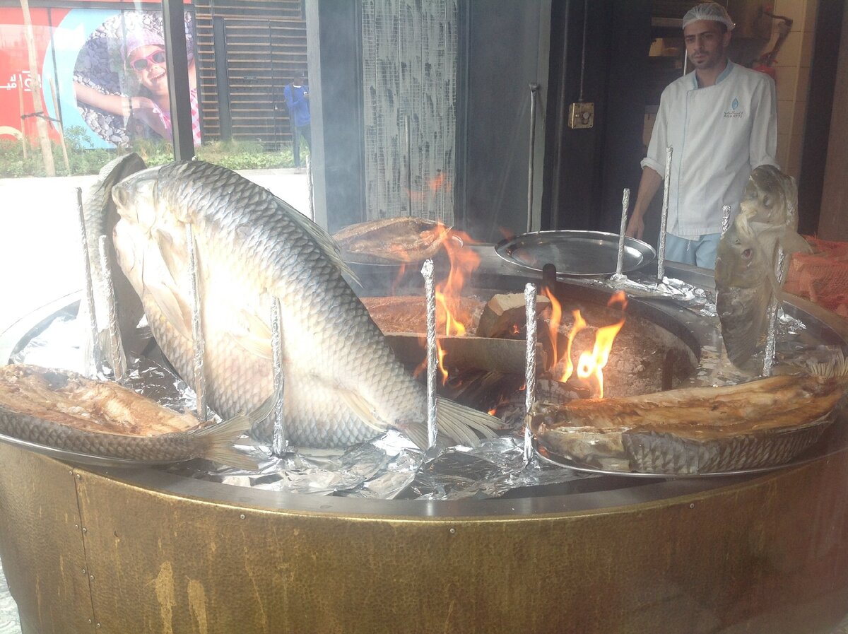 Нам стало интересно, что именно готовили повара из огромного карпа. Оказывается, это рыбное блюдо носит название «масгуф». Главная его особенность: специфика разделки рыбы и и своеобразный способ жарки на открытом огне и углях.