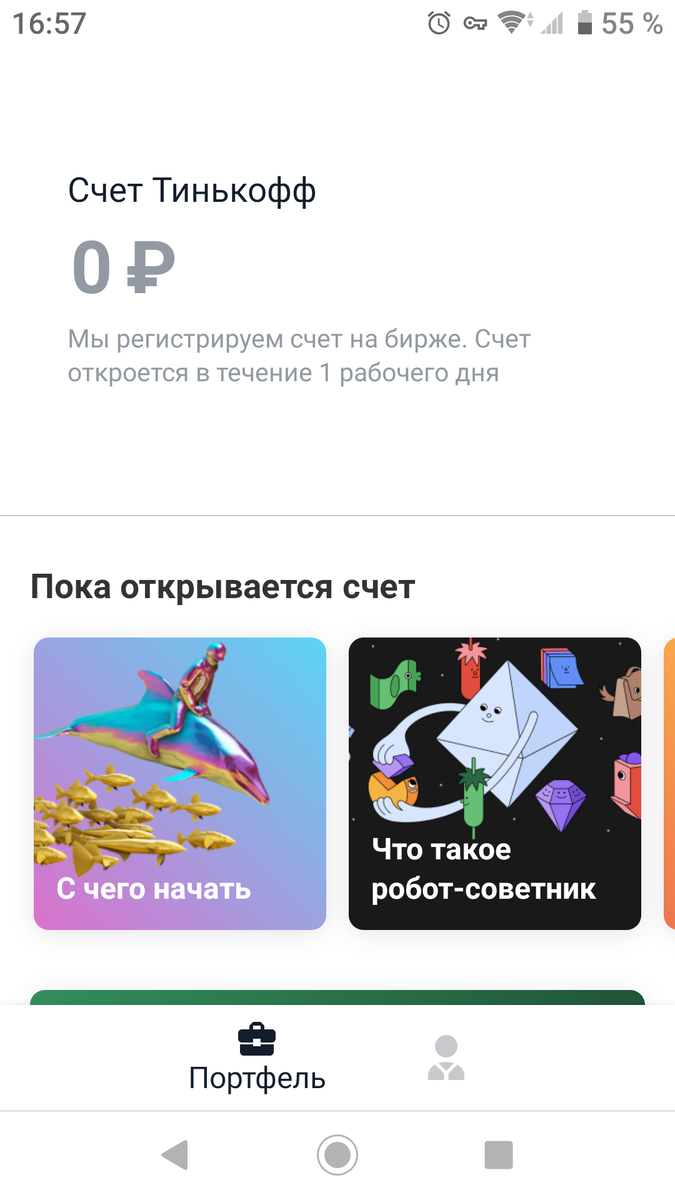 И что странно, я-то ожидал что раз уж мне дали доступ к приложению, то можно будет там хотя бы посмотреть, что есть на рынке, даже не имея счёта. На сайте же они показывают какие-то котировки акций, и другие весёлые картинки. А тут уныние, и только ссылки на «с чего начать» и «что будет, когда будет счёт». И нет вкладки с теми самыми уроками, за которые дают подарки, но тут ладно, может всё появится вместе со счётом.