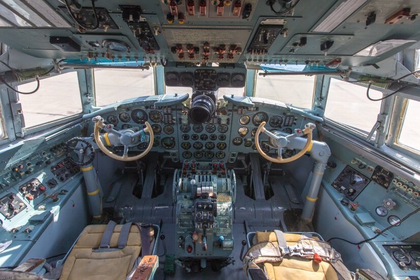 Такие же точно стоят штурвальные колонки, на них навешены те же самые полукруглые штурвалы. Правда, на левой колонке бросается в глаза большое черное колесо управления разворотом передней ноги, а над приборной доской висит круглый экран радиолокатора.