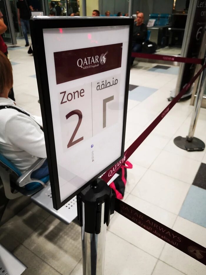 Первыми загружаются с 1й зоны и идут в конец салона. И далее по очередности. Удобно, если бы все умели думать и читать одновременно. А так, по старой русской традиции - "а чего это они идут, а мы стоим? А ну пошли бабоньки, тоже пройдем, вне очереди". И ломятся всем колхозом. За ними устремляются другие, менее стойкие. У контроля их всех разворачивают обратно. И так повторяется несколько раз. Называется не получится так хоть согреемся. 4я зона - это первые ряды. Заходят последними и выходят первыми.До Дохи лететь 5 часов. Самолет арбуз а330-300. Места много, ничего не упираются с моими 180 см. По крайней мере до того, как впереди сидящие начнут кресло с разбега опускать. Опускаются кресла очень резко, и сразу до конца. Пружин нет. Поэтому нужно быть аккуратнее, чтобы обедаюший на вашем кресле сзади пассажир случайно потом вам не вылил сок на голову.Несмотря на то, что перелет ночной, кормят полноценно.