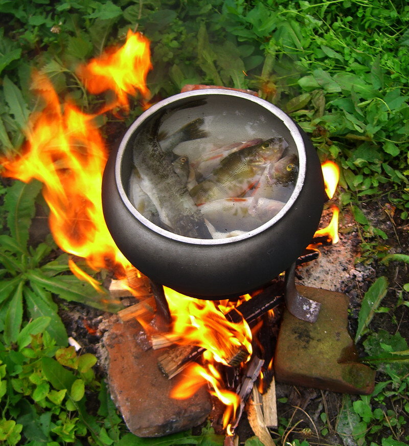 Моё самое любимое блюдо на рыбалке — это тройная уха. Её приготовление занимает значительное время, блюдо готовится в несколько этапов. После потрошения и разделки рыбы (не забудьте удалить жабры из головы) нужно оценить количество, приготовленное для варки. Варить будем в три этапа, поэтому на пяти-шестилитровый котелок надо не менее 5-6 кг, а лучше и больше рыбы. В первую варку обычно кладутся мелкий окунь и части щук. Рыба закладывается в максимальном количестве: хотя объём жидкой части от этого уменьшается, зато навар становится более густым. Рыба варится 15-20 минут, после чего убирается из котелка. Во вторую варку я предпочитаю добавлять щучьи головы и, возможно, ещё какие-то более ценные виды рыб. Так же, как и первую партию рыбы, вторую тоже удаляем после 15-20 минут варки. Таким образом мы получаем наваристый бульон, после чего начинаем добавлять уже другие ингредиенты. В первую очередь это касается приправ. Ни одна уха не обходится без лаврового листа, перца-горошка и душистого перца. Естественно, можно добавлять и другие специи, но это опять же дело вкуса. Обязательно нужно положить пару головок репчатого лука и всё это посолить по вкусу. Можно добавить и другие овощи, такие как картофель и морковь, но лично я этого не делаю. Некоторые добавляют рюмку водки, на вкус это влияет несильно, но зато уха приобретает прозрачность. Добавляется также и рыба, в третий раз лучше всего класть или красную рыбу, или судака, ну, а за неимением оных можно обойтись и просто самыми крупными экземплярами из тех, что вам удалось поймать. Ведь именно эта рыба и будет подана к столу вместе с ухой. Если уха сделана правильно, то очень часто с утра недоеденная часть превращается в желе, но это, конечно, больше зависит от рыбы, которая используется при варке. Вообще жирность и вкусовые качества одного и того же вида рыбы зависят не только от водоёма, но и от времени года. Самая наваристая уха, на мой взгляд, получалась в зимний период из мелких окуней и ершей. Имеет значение, и на каком огне приготовлено блюдо, на костре оно почему-то получается особенно вкусным.