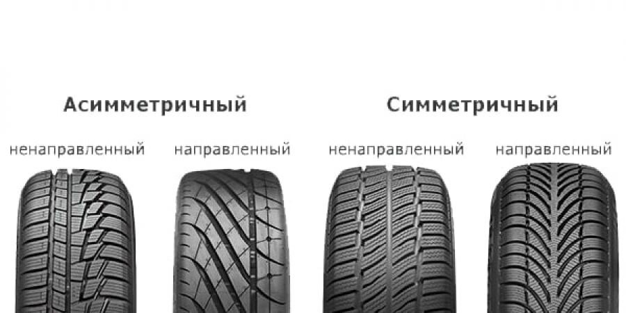Шины с асимметричным рисунком протектора Ассиметричные шины – это еще один вид, который создан для обеспечения максимальной устойчивости автомобиля, как на сухом, так и на влажном покрытии. Асимметричный рисунок протектора имеет две стороны – наружную и внутреннюю, одна из которых предназначена для сухой дороги, другая – для влажной. Как правило, внутренняя часть шины более жесткая, благодаря чему и обеспечивается отменная устойчивость шины.