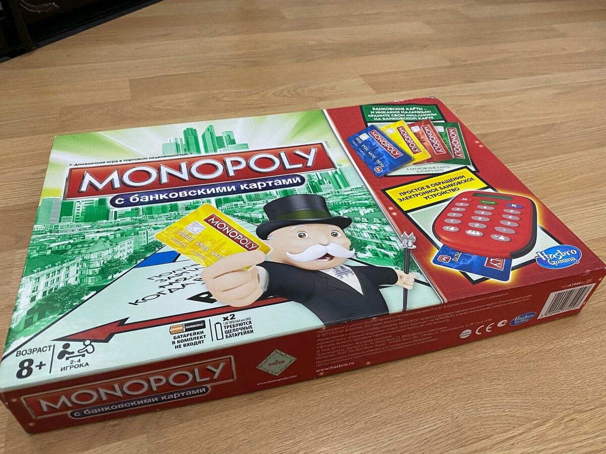 Это новая версия монополии, где раньше были бумажные деньги, сейчас же идут пластиковые банковские карточки и банкомат.