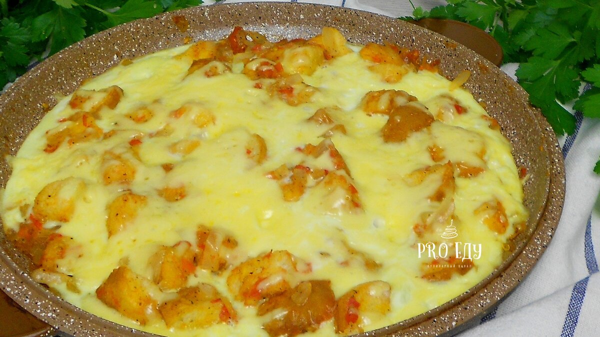 - Яичной массой заливаем содержимое сковороды и на небольшом огне томим под крышкой пару минут (перемешивать не нужно)