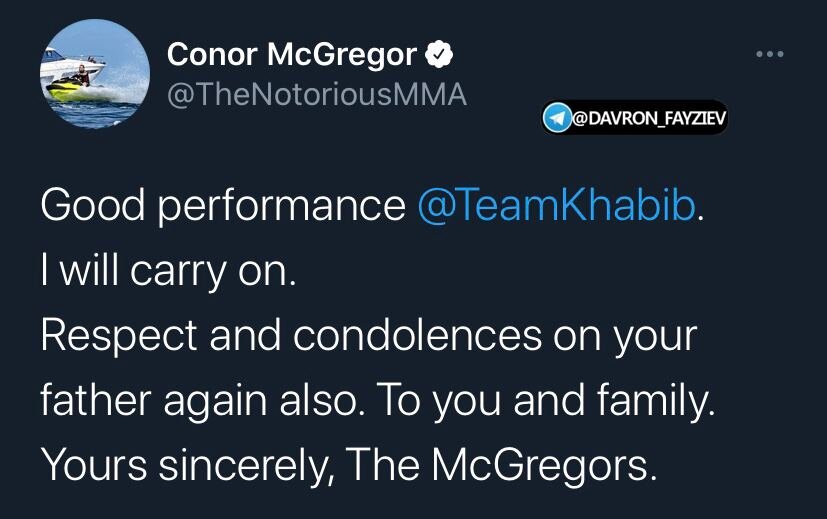 Даже Conor McGregor поздравил тёплыми словами Хабиба Нурмагомедова супер👍👍👍