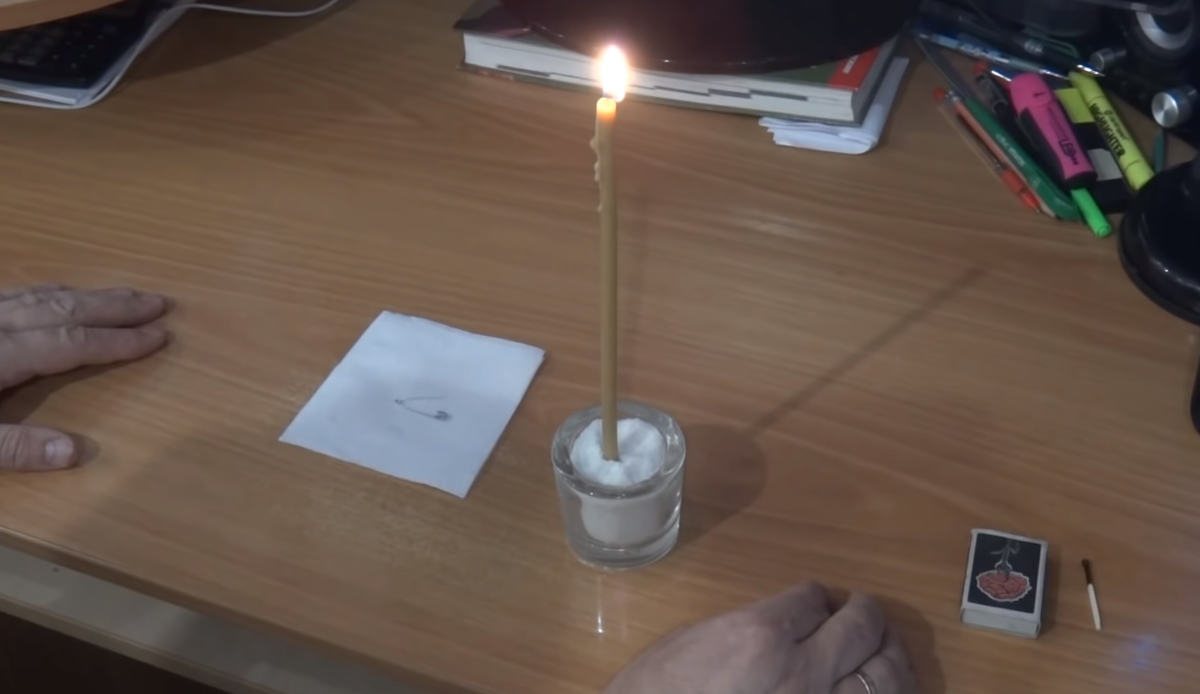 Расстелите на столе чистую салфетку (лучше красивую, хлопковую, хорошо проглаженную — этой вещью вы оказываете уважение удаче). На салфетку выложите булавку, рядом поставьте свечу.
