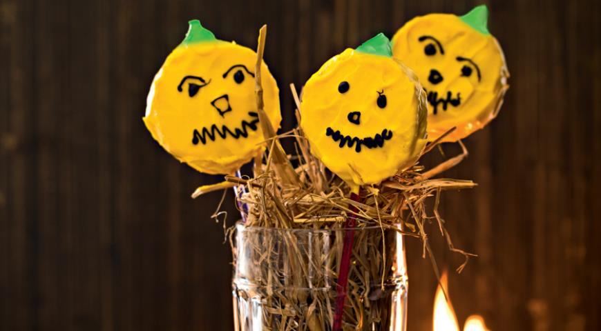 Наколите каждый кружок бисквита на шпажку как леденец – насквозь, чтобы сверху торчал конец шпажки длиной 5 мм. Смажьте со всех сторон ровным слоем оранжевого крема и дайте подсохнуть. Затем при помощи зеленого крема сделайте тыкве «плодоножку», обмазывая торчащий край шпажки.