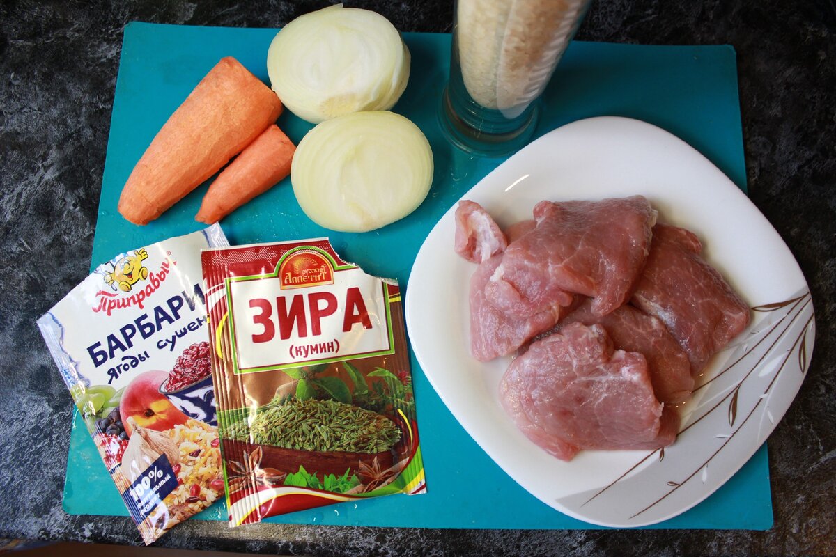 Ингредиенты, которые нам понадобятся: лук, морковь, свинина, рис, зира, барбарис, соль.