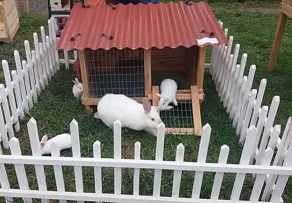 В таких выгульных зонах для кроликов можно установить домики или клетки, также там предусматриваются и кормушки.