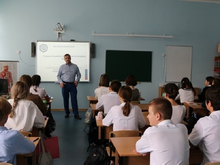 Учительский портфель взял в руки руководитель Управления ФНС России по Республике Крым Роман Наздрачёв. В чём заключается миссия налоговых органов, на чём строится налоговое законодательство Российской Федерации, кто такие налогоплательщики и какие налоги уплачивают обычные граждане, как проходило становление налоговых органов в Крыму после весеннего референдума 2014 года – все эти вопросы глава налогового ведомства республики обсудил с подрастающим поколением. «Процесс проходил стремительно, необходимо было за кратчайшие сроки переобучить сотрудников, обеспечить материально-техническое оснащение налоговых инспекций, заново сформировать базу налогоплательщиков, запустить процесс их регистрации. Если в 2015 году в Крыму было зарегистрировано 15 тысяч организаций, то сегодня – вдвое больше, а количество индивидуальных предпринимателей увеличилось более чем в 3 раза и на сегодняшний день составляет около 67 тысяч. Из года в год укрепляется динамика уплаты налогов и сборов по республике: если в 2014 году эта цифра составляла 28,7 миллиардов рублей, то в 2019 году – 77,5 миллиардов рублей. Это говорит о налоговой грамотности и ответственному подходу к обязанности уплаты налогов жителями Республики Крым», – рассказал Роман Наздрачёв.