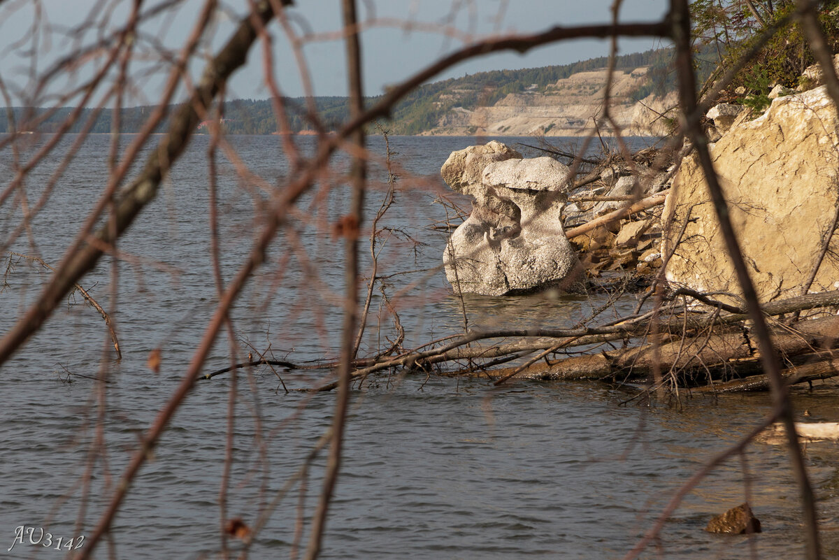 Осторожно продвигаясь вперёд, мы поняли, что время собирать камни. Вокруг валялись удивительные экземпляры белоснежного гипса, причудливо обработанные водой, а также образцы разноцветного кристаллического и волокнистого гипса. На берегу можно отыскать углефицированные в известняке остатки древних растений, пособирать окаменевшую за миллионы лет древесину. В трещинах известняка мы обнаружили небольшие сталактиты и сталагмиты, образованные медово-жёлтым арагонитом, а на плитах мергелей увидели отпечатки древнего Пермского моря.