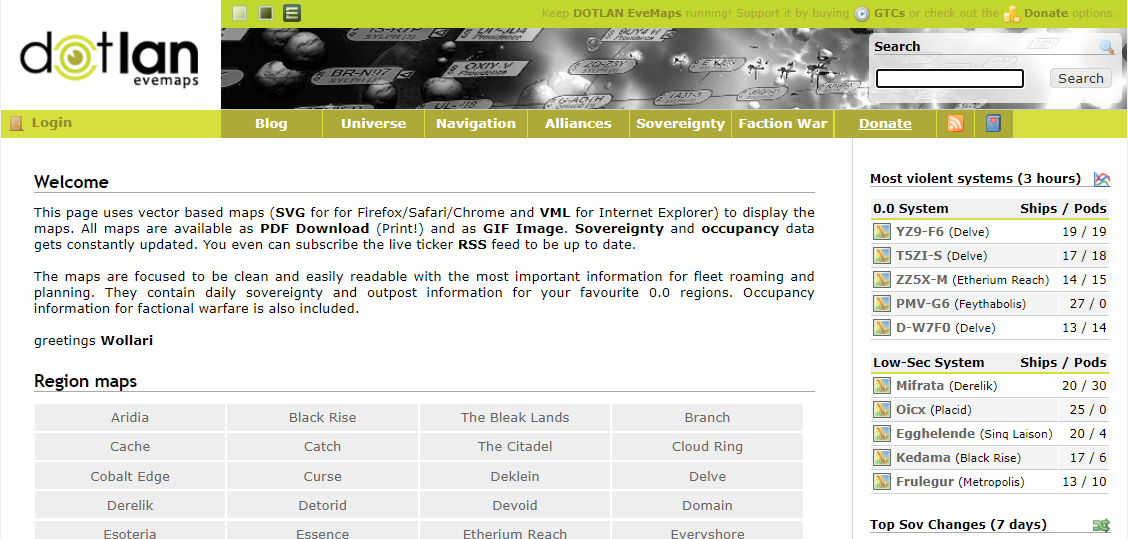 Dotlan это информационный сайт для пользователей Eve Online. На нем можно увидеть множество полезной информации, начиная с карты мира, суверенитету, информации об альянсах и корпорациях, прыжковой дистанции капиталов и все в подробном виде. В этой статье мы разберем самые необходимые и часто используемые вкладки и попытаемся разобраться в основах. Будут рассмотрены не все вкладки, а наиболее интересные для нас.