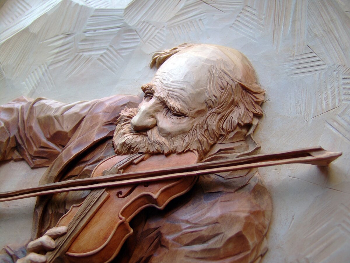 Случайным образом (хотя случайностей не бывает) я нашла фотографию его работы под названием "Старый скрипач". Сердце даже екнуло от этой проникновенной красоты, невероятной передачи эмоций, чувств... Картина, вырезанная из дерева. А сколько в ней жизни! Глядя на нее я слышу скрипку, вижу движение морщинок этого старого музыканта, чувствую, как он погружен в момент "сейчас". И этот пес рядом с ним, собирающий монетки в шляпу...Только об этой картине можно написать целую статью!