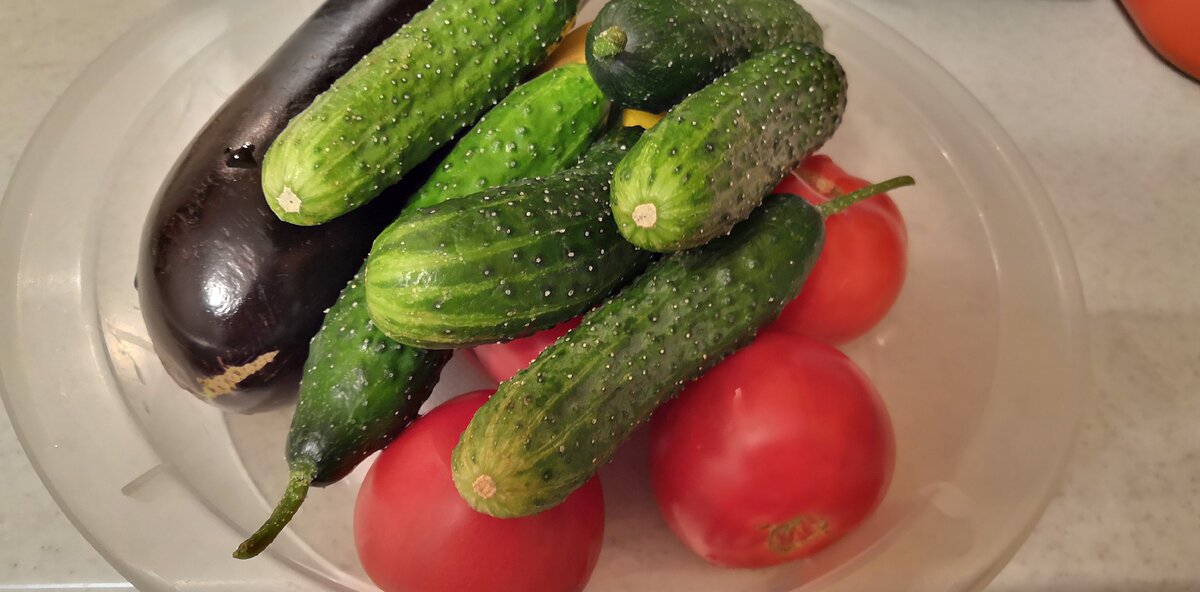 Простые помидоры, огурцы и баклажан, но как колоритно лежат)))) Не правда ли?