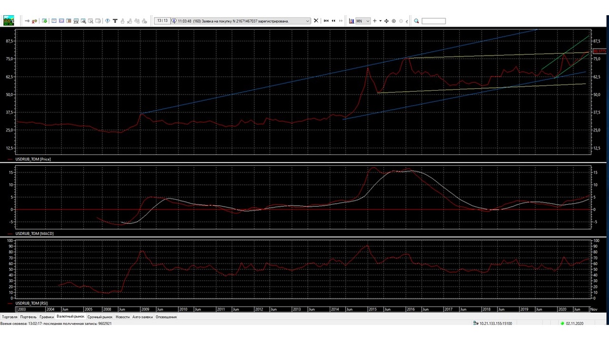 Сейчас самое интересное время до 3 ноября 2020 года, потому что это самое таинственный период. Если не удачно зайти или выйти из валюты, можно потерять деньги, поэтому лучше всего сейчас наверно не стоит заходить в валюту, стоит постоять в стороне и принимать решение уже 7-8 ноября 2020 года. Причин много, есть вероятность просадку валют вниз, если выборы в США пройдут не по плану, будет обострение противостояние между республиканцами и демократами, это скажется на динамику движения на движение доллар/рубль, евро/рубль. В Европе сейчас куча проблем, проблемы США, в Европе будет обострение политических и экономических проблем, все это потянет евро вниз. В понедельник доллар/рубль пробил уровень 80,0, евро/рубль пробил уровень 93,0, хотя возможны ложные пробои уровня сопротивления.